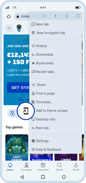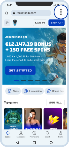 Allez sur la page d’accueil de Rocket Spin et appuyez sur les trois points pour ouvrir le menu du navigateur.